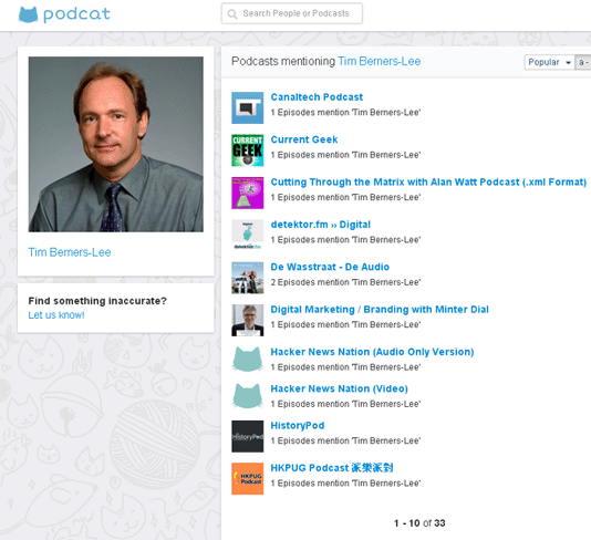 פודקסטים – קובצי אודיו שאפשר להירשם אליהם לקבלת עדכונים , הפכו להיות פופולריים. על פי מה שנכתב באתר, Podcat נוצר כדי לסייע למשתמשים לגלות פודקסטים חדשים ולקדם יוצרי פודקסטים. Podcat עוקב אחרי פודקסטים ב- iTunes. ומחלץ שמות של אנשים שהופיעו בערוצים השונים. אפשר לחפש על פי שם פודקסט ועל פי שמות של אנשים שהופיעו בפודקסטים. כך למשל כאשר הקלדתי בתיבת החיפוש את שמו של המדען ממציא הווב Tim Berners-Lee קיבלתי רשימה של 33 פודקסטים בהם אוזכר .