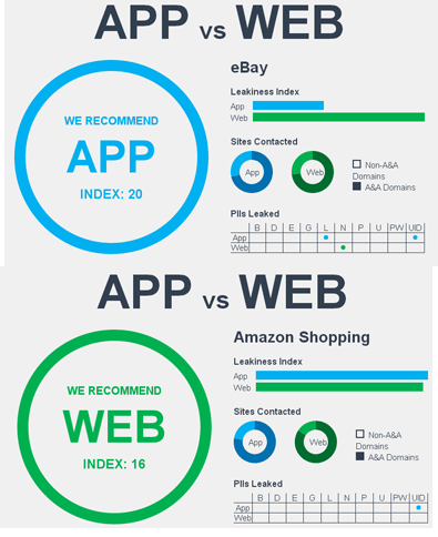 מבדיקה באתר זה עולה למשל שבאמזון עדיף מבחינת שמירה על הפרטיות להשתמש באתר מובייל ואילו ב- eBay ההיפך.