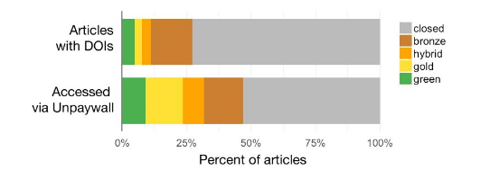 ההערכה היא שלפחות 28% מהספרות המדעית/מחקרית היא בגישה פתוחה ושיעור זה גדל במיוחד בשל הגידול במסלול הזהב (מאמרים בגישה פתוחה מכתבי עת ) והמסלול ההיברידי.