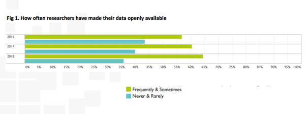 64% מהעונים על הסקר פתחו ב-2018 את הנתונים של מחקריהם . עליה של 4% ביחס ל-2017 ו-7% ביחס ל-2016.
