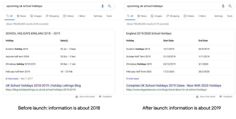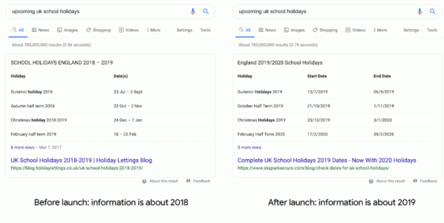 כך למשל, כפי שמצוין בכתבה בנושא, השאילתה "upcoming uk school holidays” מציגה היום נתונים עדכניים משנת 2019/2020, לפני השקתו של האלגוריתם התוצאות היו משנת 2018/2019