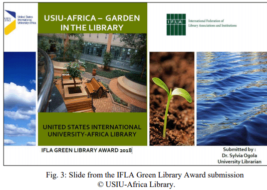 מאמר בכנס IFLA 2019 מתאר פעילויות ,אירועים ופרויקטים כאלה בספריות שזכו בפרס הספרייה הירוקה של IFLA בשנים 2016-2019. פרס הספרייה הירוקה של IFLA נותן לספריות הזדמנות להציג את הפרויקטים שלהן ברוח Agenda 2030, משמש השראה לספריות נוספות ללכת בדרכן, ומדגיש את תרומתן החשובה של הספריות להשגת המטרות בתחום. הספריות הזוכות שפעילותן בתחום מתוארת במאמר הן מאירלנד, קנייה, אוקריאנה, גרמניה, קרואטיה וקולומביה. הפעילויות המוצגות מבהירות שירוק הוא מעבר להיבט האקולוגי אלא מודעות לשמירה על החיים בכדור הארץ על כול היבטיהם.