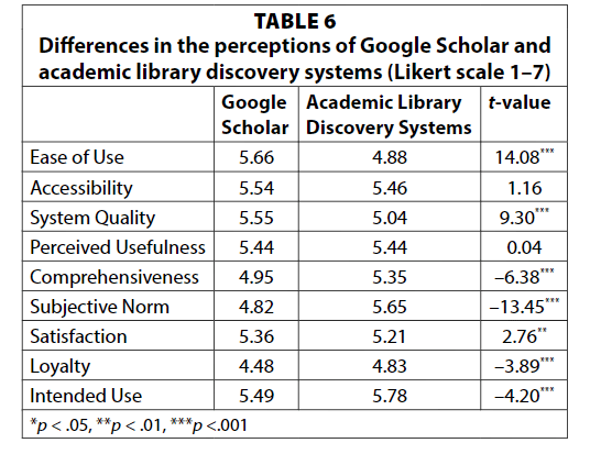 המערכות לגילוי ידע בספריות נתפסות כמקיפות, אמינות ויעודיות יותר מגוגל סקולר בעוד שגוגל סקולר נתפס כקל יותר לשימוש, איכותי ושביעות הרצון הכללית מהשימוש בו גבוהה מזו של מערכות ספרייה לגילוי ידע . בהקשר זה, מן הראוי לציין שלמרות שבאופן כללי מידת שביעות הרצון מהשימוש בגוגל סקולר הייתה גבוהה יותר, הרי בפרמטרים מסוימים כגון שביעות הרצון מאיכות וכמות התוצאות הייתה גבוהה יותר במערכות הספרייה.