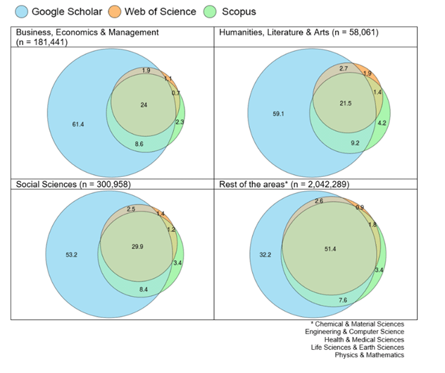 מחקר שבדק זאת במדגם של 2500 מסמכים ב- 252 קטגוריות נושאיות מצא שכמות משמעותית של מסמכים במדעי החברה ובמדעי הרוח שנמצאו בגוגל סקולר לא כוסו במאגרי המידע Web of Sciences ו- Scopus . הסיבה הייתה שמאגר המידע לא כיסה את כתב העת בזמן פרסום המאמר.