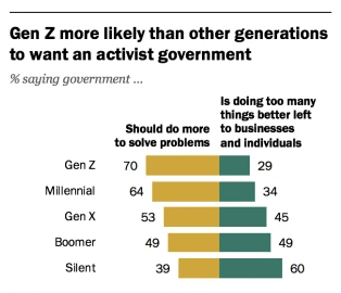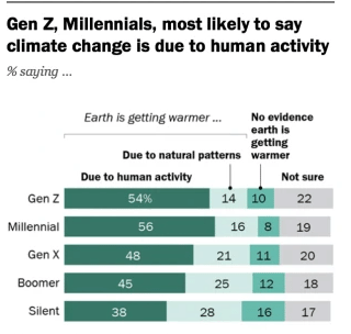 מייחסים את התחממות כדור הארץ לגורם האנושי , ודומים לדורY בהעדפותיהם הפוליטיות במיוחד לקראת הבחירות הקרבות 2020 – יעדיפו את המועמד הדמוקרטי, כמו כן הדורות הצעירים שונים מהמבוגרים בדעותיהם לשינויים משפחתיים וחברתיים בכול הקשור להעדפות מיניות ולמשפתות חד הוריות.