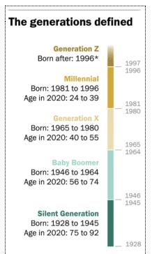נהוג לחלק את האוכלוסייה לכמה דורות בהנחה שדור מתייחס לתקופה של 15-20 שנה. בני הדור השקט – ילידי 1928 -1945 , דור הבייבי-בום – ילידי 1946 -1964 , דור ה-X – נולד בשנים 1965-1980 , דור ה-Y נולד בשנים 1981 – 1996 והדור הצעיר ביותר דור ה-Z עליו נמנים ילידי 1996 ואילך.