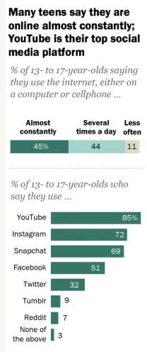 ממצאים שהתפרסמו בכתבה ב-14 במאי 2020 שופכים אור על הנושא. הממצאים מבוססים על 2 סקרים של Pew Research Center שנערכו בסוף 2018 – האחד בקרב 920 בני נוער אמריקאים בגילאי 13 -17 והשני סקר ארצי מייצג של 10,682 מבוגרים מגיל 18 ומעלה .