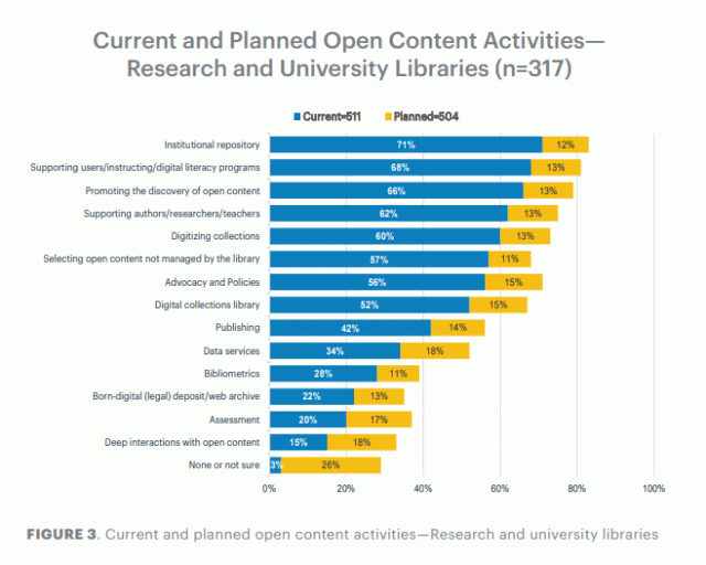 מממצאי המחקר – 97% מהמשיבים בספריות אקדמיות וספריות מחקר מעורבים בפעילויות שקשורות לגישה פתוחה ורובם מתככנים פעילויות חדשות. צפוי גידול של 10-18 אחוזים בפעילויות מסוג זה.