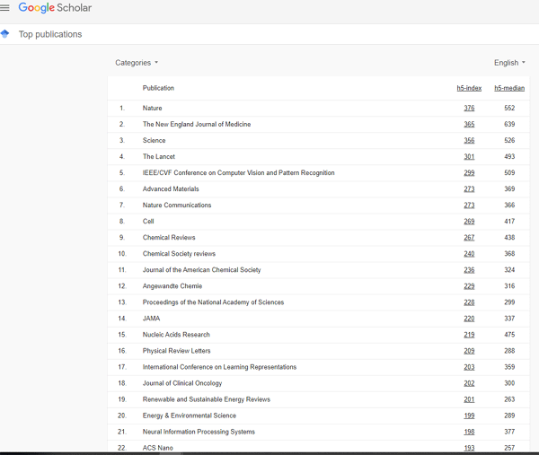 אפשר לראות את 100 כתבי העת המובילים במספר שפות ממוינים על פי מדדי h5-index and h5-median , אפשר לבחור בקטגוריות נושאיות רחבות ובתתי קטגוריות וגם לדפדף ב- 100 כתבי העת המובילים על פי שפות כמו כן אפשר לראות את המאמרים בכתבי העת השונים עם מדדי הציטוטים שלהם.