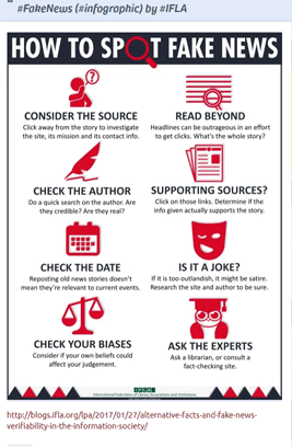 - שיתוף פעולה- על הספריות הציבוריות לשתף פעולה עם בתי ספר מקומיים, ארגונים, מועצות מחוזיות פוליטיקאים וקבוצות קהילתיות בכדי לעזור להגיע לקהלים רחבים יותר. להמשיך ולחנך וליידע את הציבור על הסכנות הכרוכות בחדשות מזויפות ולעודד אנשים, במיוחד בעלי כוח לפעול כנגד התופעה. ספרנים אקדמיים צריכים לשתף פעולה גם עם חברי סגל ומורים בכדי לעזור ביישום אוריינות ומיומנויות ביקורתיות כחלק מתכניות הלימודים בהכנת התלמידים טוב יותר ללמידה ומחקר בעולם המקוון.