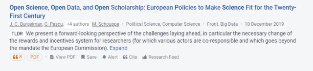 TLDRs – Too Long; Don't Read הם סיכומים קצרים במיוחד שכוללים בדרך כלל את המטרה והתוצאות העיקריות של מאמר מדעי שנוצרו תוך שימוש בטכניקות של בינה מלאכותית. מאפיין חדש זה שנוסף לאחרונה למנוע חיפוש המדעי Semantic Scholar זמין בגרסת בטא לכמעט 10 מיליון מאמרים/פריטי מידע. הוא מסייע למשתמש לבחור ביתר קלות את המאמרים/פריטי המידע הרצויים לו.