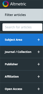 בכתובת Altmetric – Top 100 articles – 2020 יש מנוע חיפוש ייעודי ל- 100 המאמרים המובילים ב- 2020 עם אפשרות לסינון מראש על פי מספר פרמטרים: נושא, כתב עת/אוסף , מו"ל, שייכות מוסדית, וסוג גישה – פתוחה ( 46 פריטים), חופשית (25) וסגורה (29) מהסיווג על פי אופן גישה ניתן להסיק שרוב הפריטים חופשיים. כאשר בוחרים בפריט מסוים אפשר לקבל גם מידע מעניין על סוג המקורות בהם אוזכר –פוסטים מבלוגים ציוצים בטוויטר, עמודי פייסבוק, וערכים בוויקיפדיה ועוד.