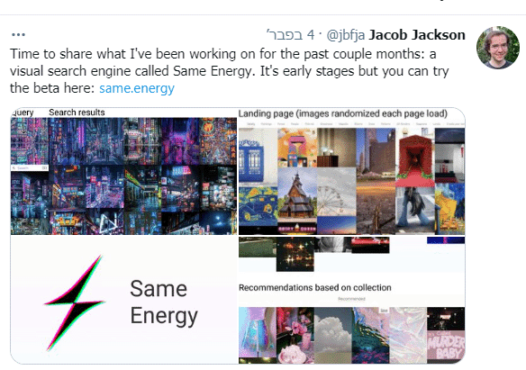 Same Energy הוא מנוע חיפוש ויזואלי חדש בגרסת בטא שעושה שימוש בבינה מלאכותית.. החיפוש בו אפשרי בשאילתת טקסט או בהעלאת תמונה וגם בבחירה מתוך אוסף התמונות שמוצג בדף הראשי. התוצאה מסך שלם של תמונות בהתאם. בראש עמוד הבית של המנוע מוצגות הקטגוריות