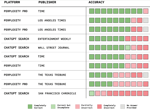 שיעורי שגיאות הציטוט השתנו במיוחד בין הפלטפורמות שנבדקו. Perplexity ענה בצורה שגויה על 37 אחוז מהשאילתות שנבדקו , בעוד ש-ChatGPT Search זיהה באופן שגוי 67 אחוז (134 מתוך 200) מהשאילתות . ב- Grok 3 נמצא  שיעור השגיאות הגבוה ביותר-94 אחוז.