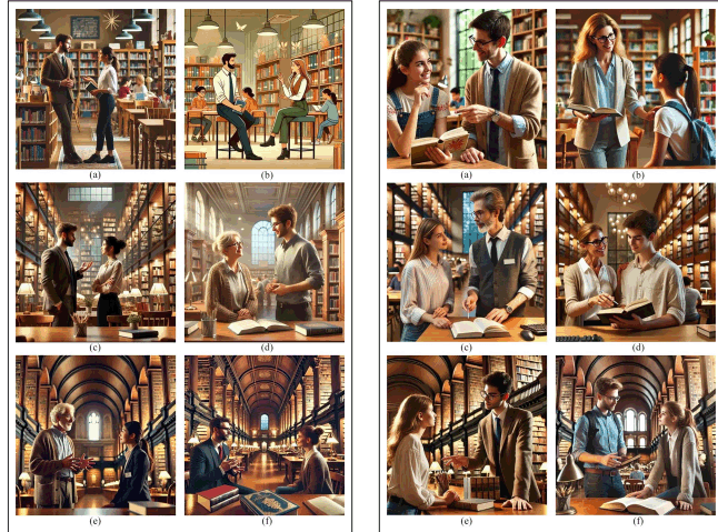 התמונות של ספרנים בסביבות שצוינו, תארו ספרנים באינטראקציה עם ספרן אחר או ביעץ למשתמשי הספרייה. התמונות שנוצרו הוערכו לאחר מכן על סמך קריטריונים כגון מיקום, רמזים חזותיים המצביעים על גיל ומגדר ומאפייני סביבת הספרייה